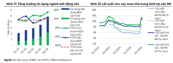 Dữ liệu của VPBankS cho thấy, đến cuối năm 2025, dư nợ tín dụng bất động sản đạt khoảng 4,7 triệu tỷ đồng, chiếm 25,5% tổng dư nợ nền kinh tế, tăng mạnh so với mức 21 – 22% của giai đoạn trước. Điều này phản ánh mức độ phụ thuộc lớn của thị trường vào nguồn vốn ngân hàng.
