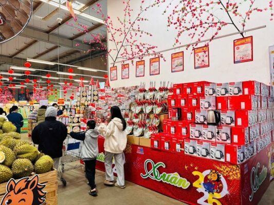 Tại hệ thống MM Mega Market đã tăng dự trữ hàng hóa từ 10 – 30% so với năm trước, trong đó có khoảng 30.000 tấn hàng khô và 2.800 tấn thực phẩm tươi sống. Saigon Co.op cũng chủ động tăng trữ lượng lên đến 40% để đảm bảo bình ổn giá. Các khu vực lối vào siêu thị hiện đã ngập tràn bánh kẹo, giỏ quà Tết, bia rượu và đồ trang trí được thiết kế bắt mắt, đậm sắc xuân.