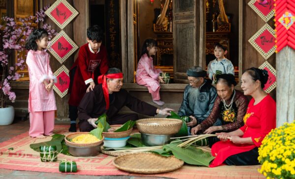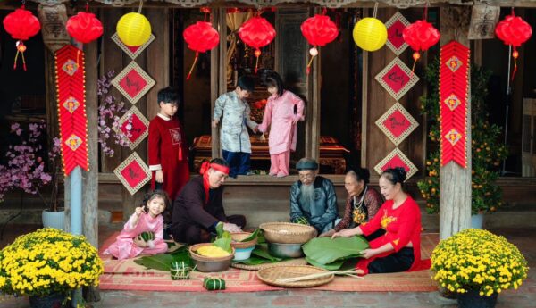 Khi chiều buông xuống cũng là lúc những nồi bánh lớn được đặt lên bếp. Lửa đỏ bập bùng, khói quyện mùi lá dong, mùi nếp mới – thứ hương thơm rất riêng của những làng quê còn giữ được Tết.