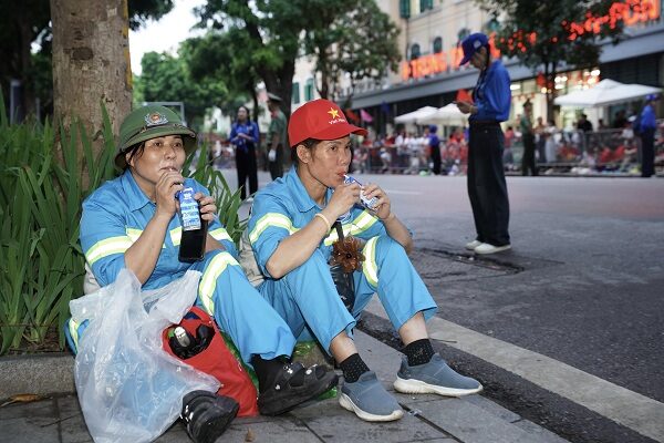 Phút nghỉ ngơi và tiếp thêm chút năng lượng bằng sữa tươi Vinamilk của các chị góp phần quan trọng để đại lễ diễn ra với những tuyến đường sạch sẽ, ngăn nắp. (Ảnh: Vi Nam)