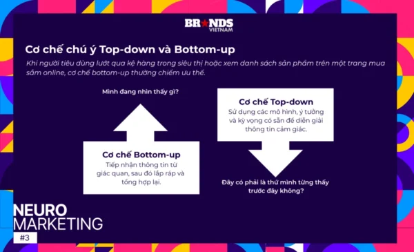 Trong khi đó, top-down là sự chú ý được dựa vào mục tiêu mua sắm và kinh nghiệm sẵn có. Khi đã có ý định tìm một sản phẩm hoặc thương hiệu quen thuộc, não bộ sẽ tập trung “quét” môi trường xung quanh để tìm đúng thứ mình đang cần, giống như một chiếc đèn chiếu vào đối tượng được chọn.