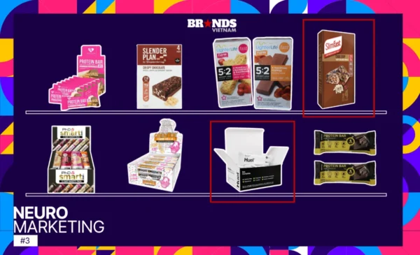 Trong số các thương hiệu cạnh tranh, chỉ có Huel đạt “khả năng dễ nhận diện” tương đương SlimFast. Lý do là tên thương hiệu được đặt rất lớn trên bao bì, kết hợp với thiết kế chữ đen trên nền trắng tương phản mạnh, khiến sản phẩm nổi bật rõ ràng giữa các thương hiệu khác trên kệ.