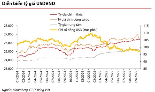 Trước đó, trong tháng 8, từ 25-26/8, Ngân hàng Nhà nước (NHNN) đã can thiệp để điều hướng tỷ giá với nhu cầu đăng ký mua ngoại tệ có kỳ hạn, có hủy ngang của các ngân hàng thương mại là khoảng 1,5 tỷ USD. Chứng khoán MBS cho biết đây được đánh giá là biện pháp linh hoạt, vừa giúp ổn định tâm lý thị trường, vừa bảo toàn dự trữ ngoại hối trong trường hợp các ngân hàng hủy giao dịch khi áp lực tỷ giá giảm về sau. Theo đó, cùng với sự giảm giá của đồng USD, áp lực mất giá của tiền đồng đã hạ nhiệt kể từ giữa tháng 9.